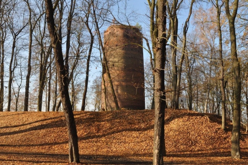 Ruiny wieży zamkowej z drugie połowy XIIIw wraz z tablicą opisującą jej historię.